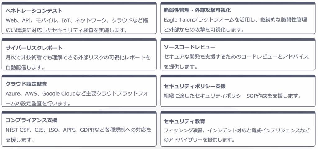 コンサルティングサービス: 各企業毎にリスク戦略の策定や脆弱性の調査などを支援します。透明性の高い、目的のはっきりした協力的なアプローチを特徴としています。​
