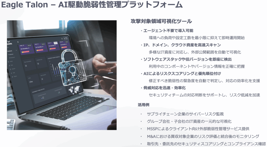 SaaSソリューション「Eagle」の開発・提供: 中小企業やMSP向けに、セキュリティ強化と運用効率の向上を実現するSaaSプラットフォームです。AI技術と専門家による実践的なサポートを融合させ、24時間365日のプロアクティブな監視、実用的な分析情報、個別の状況に応じたアドバイスを提供します。​