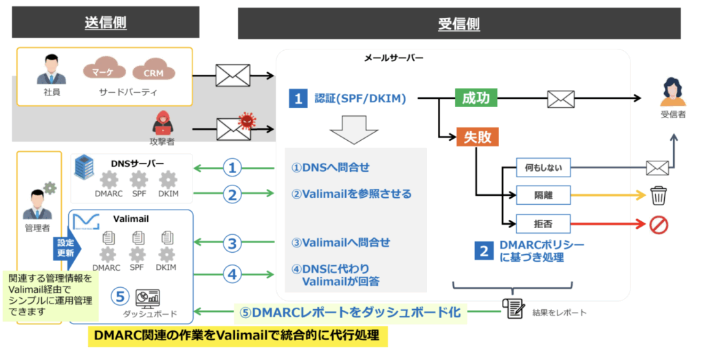 特許技術によるSPFの制限回避: メール認証の仕組みの一つであるSPFには、参照できるサーバー情報の数に「10回まで」という制限があり、多くのクラウドサービスを利用する企業ではこの制限が導入の障壁となっていましたが、Valimail社は独自の特許技術によりこの問題を解決し、正確な認証を可能にします。