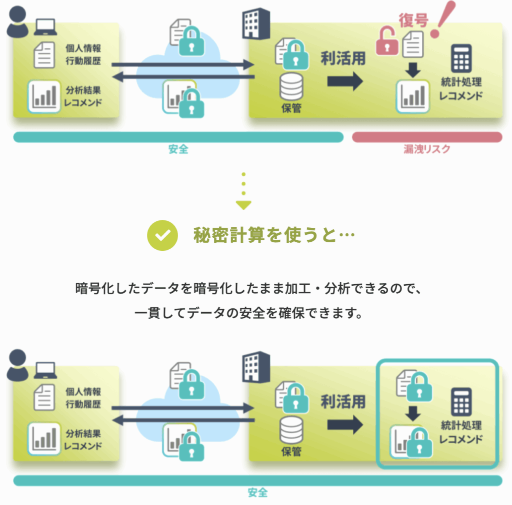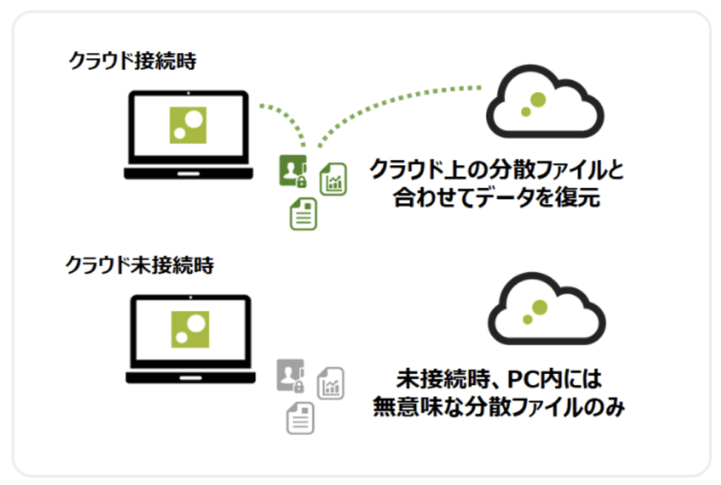 従来の暗号化とは一線を画す「データの無意味化」というコンセプトで、「情報漏洩は防ぎきれない」という現実的な視点に立ち、万が一データが外部に流出しても、それ自体を意味のないものにすることで情報を守るという画期的な発想に基づいています。​